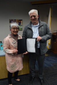 Yvonne Inciarte, asistente de la oficina del congresista Ro Khanna, presentó a Arnett un certificado de reconocimiento especial del Congreso en su penúltima reunión de la junta el 17 de noviembre.