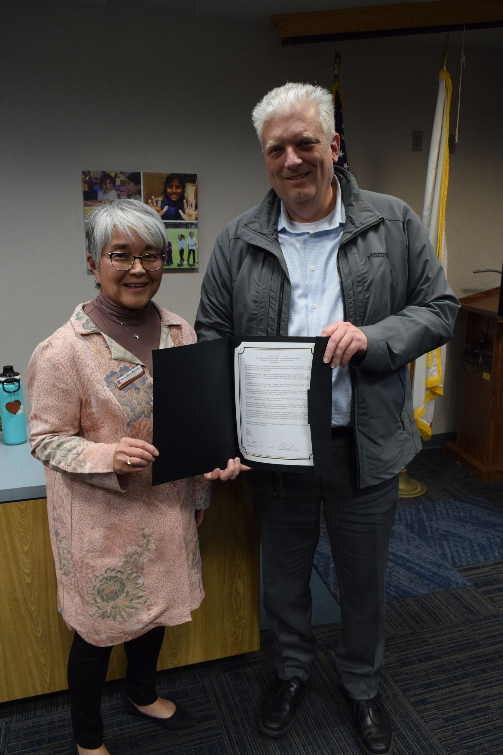 Varios líderes locales asistieron a la reunión de la Junta Escolar de Sunnyvale el 15 de diciembre para honrar al miembro de la junta Jeff Arnett por sus 19 años de servicio.